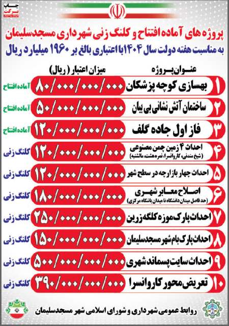 وی در ادامه گفت: اجرای این پروژهها در حوزههای عمرانی، خدماتی، تفریحی و زیستمحیطی، از جمله مهمترین اقدامات شهرداری مسجدسلیمان در سال جاری به شمار میرود که بخشی از آن در هفته دولت افتتاح و بخش دیگر کلنگزنی خواهد شد.