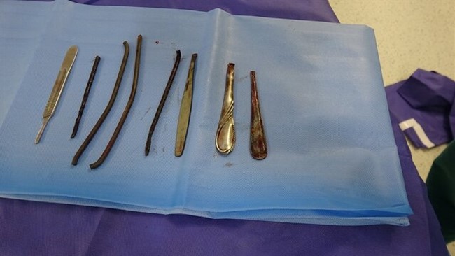 وی با اشاره به علائم بیمار گفت: بیمار، فردی ۳۴ ساله با علائم شدید درد در ناحیه شکم بود به بیمارستان مراجعه کرد. پس از انجام معاینات و اقدامات تشخیصی مشخص شد منشا درد، وجود اجسام فلزی سخت در معده بیمار است. در همین راستا بلافاصله بیمار به منظور استخراج این اجسام سخت به اتاق عمل انتقال پیدا کرد و طی جراحی ۴۰ دقیقهای، هشت قطعه جسم فلزی سخت شامل چهار دسته قاشق و چهار قطعه مفتول فلزی از معده و ابتدای دوازدهه بیمار خارج شد.