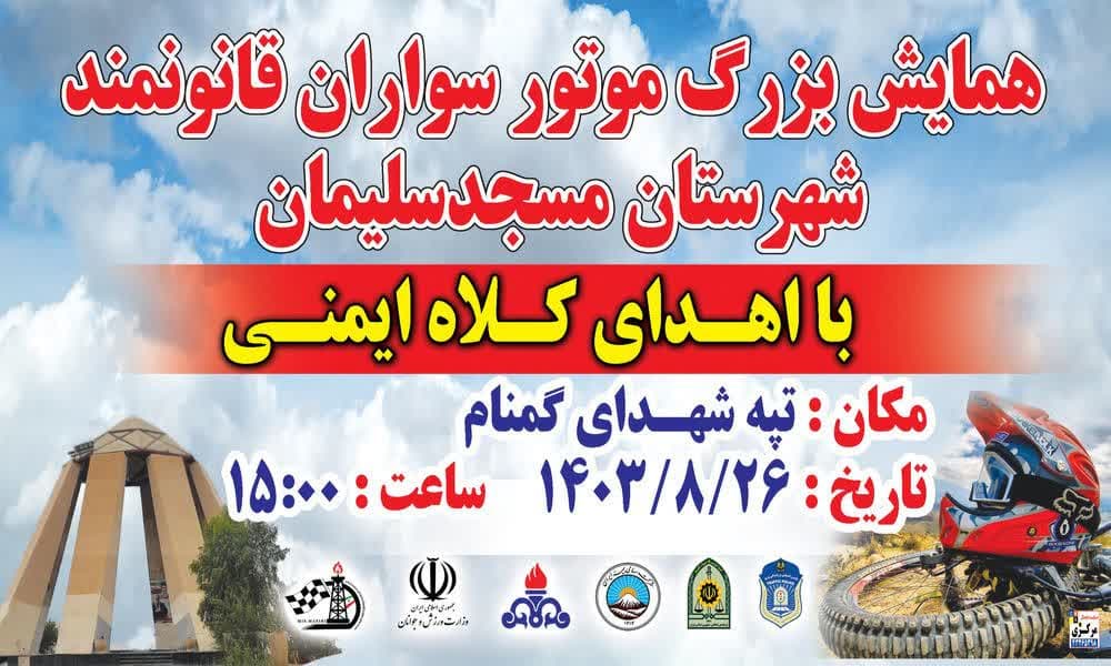 به گزارش بهار زاگرس، سرگرد سید محمد موسوی درتکمیل این خبر اظهار داشت: این همایش در روز شنبه بیست و ششم آبان ماه رأس ساعت ۱۵ در محل تپه شهدای گمنام برگزار می گردد. رییس پلیس راهنمایی و رانندگی مسجدسلیمان گفت: این همایش یک برنامه فرهنگی با هدف آموزش موتور سواران شهرستان است که آنها ضمن استفاده از کلاه ایمنی و رعایت مقررات راهنمایی و رانندگی اسایش و امنیت را به خود و سایر کاربران ترافیک هدیه می دهند.
